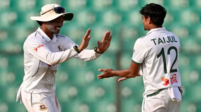 বাংলাদেশের তাইজুল ২৭ দশমিক ১ ওভার বোলিং করে ৬০ রানে ৬ উইকেট নেন। এছাড়া নাইম হাসান ২টি ও তানজিম হাসান ১টি উইকেট নেন।