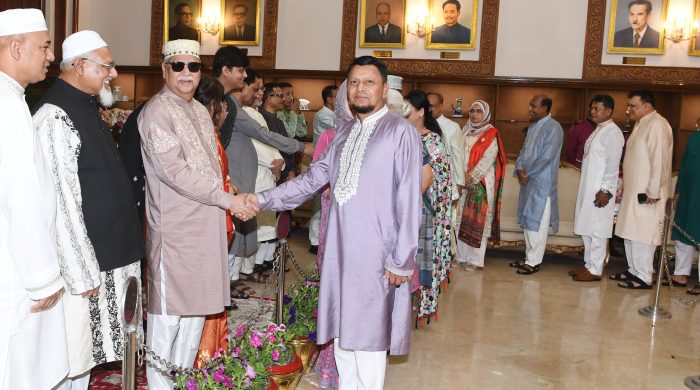 রাষ্ট্র প্রধান আজ বঙ্গভবনের ক্রিডেনশিয়াল হলে পবিত্র ঈদুল ফিতর উপলক্ষ্যে দেয়া এক শুভেচ্ছা বক্তব্যে দেশবাসীকে ধনী-দরিদ্র নির্বিশেষে ঈদের আনন্দ সকলের সঙ্গে মিলেমিশে উপভোগের অনুরোধ জানান।