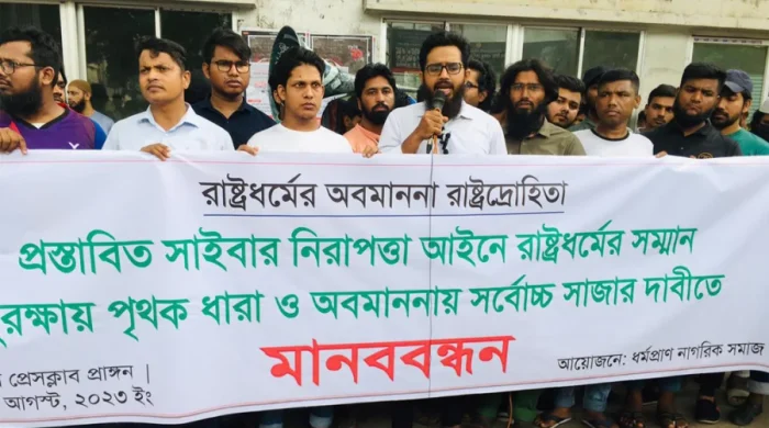 ‘রাষ্ট্রধর্মের সম্মান সুরক্ষা দেওয়া রাষ্ট্রের সাংবিধানিক দায়িত্ব। সুতরাং প্রস্তাবিত সাইবার নিরাপত্তা আইনে রাষ্ট্রধর্ম ইসলামের সম্মান সুরক্ষায় পৃথক ধারা সংযুক্ত করতে হবে। রাষ্ট্রধর্মের অবমাননা রাষ্ট্রদ্রোহিতা। সেক্ষেত্রে রাষ্ট্রধর্মের অবমাননায় এ আইনে সর্বোচ্চ